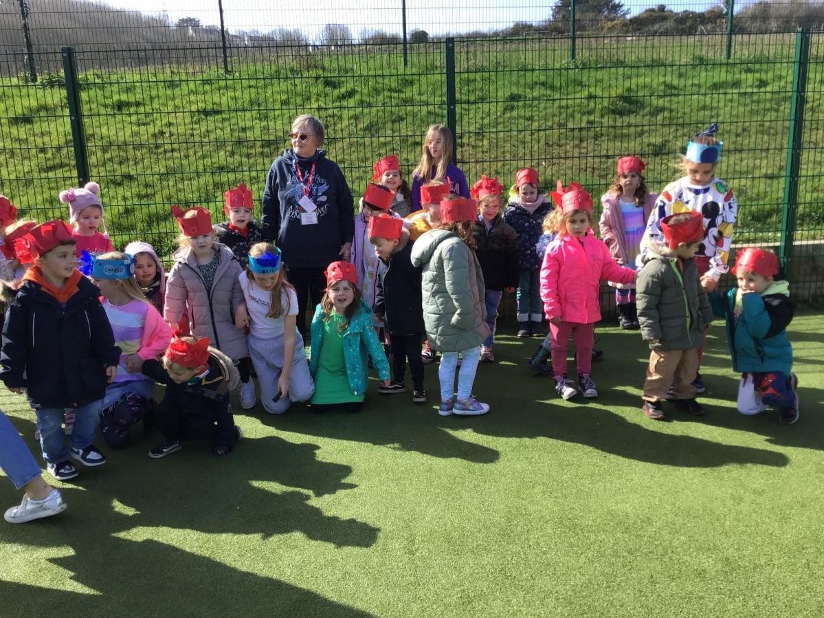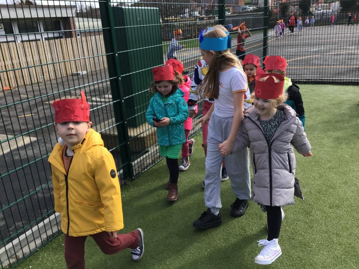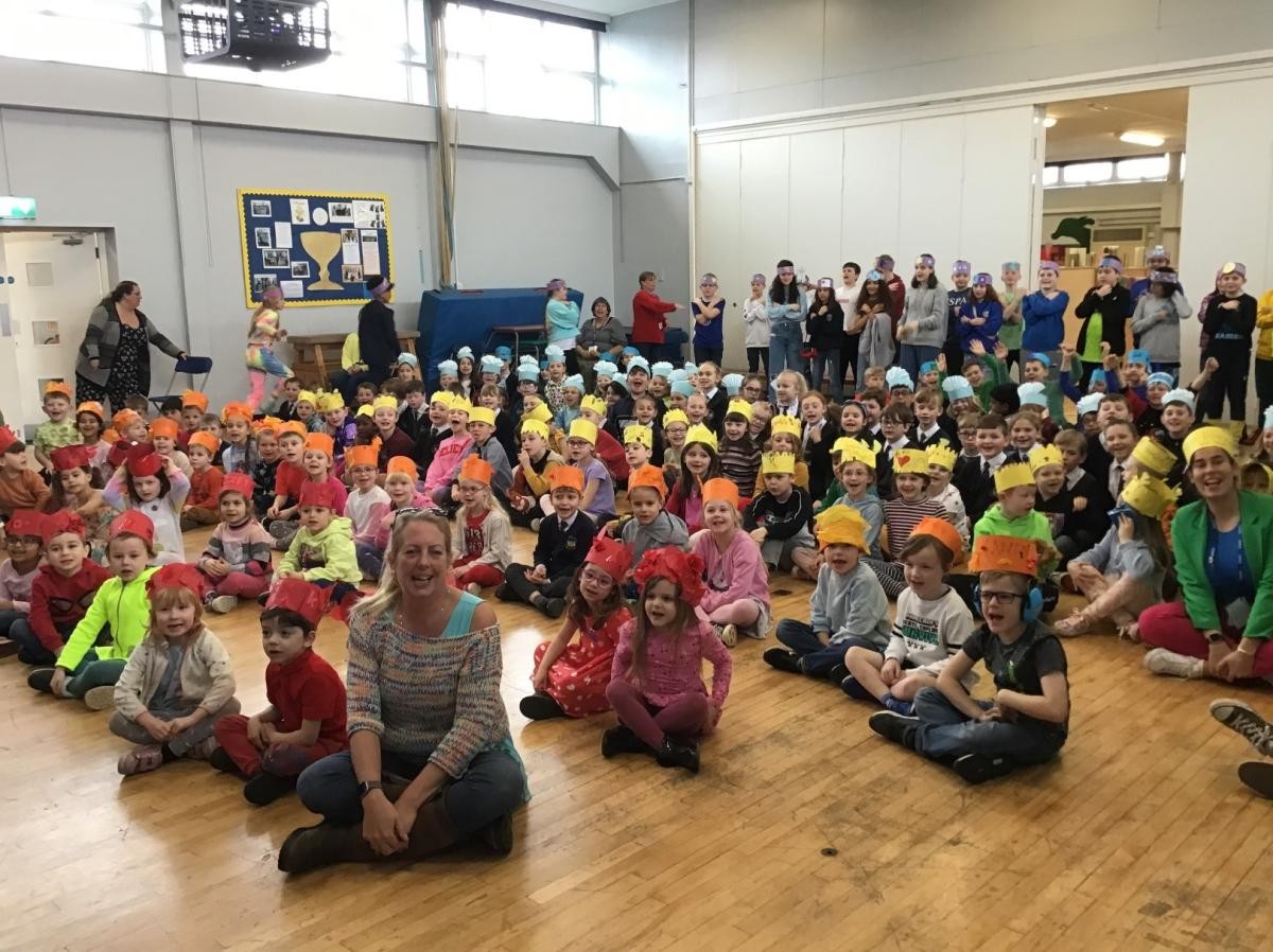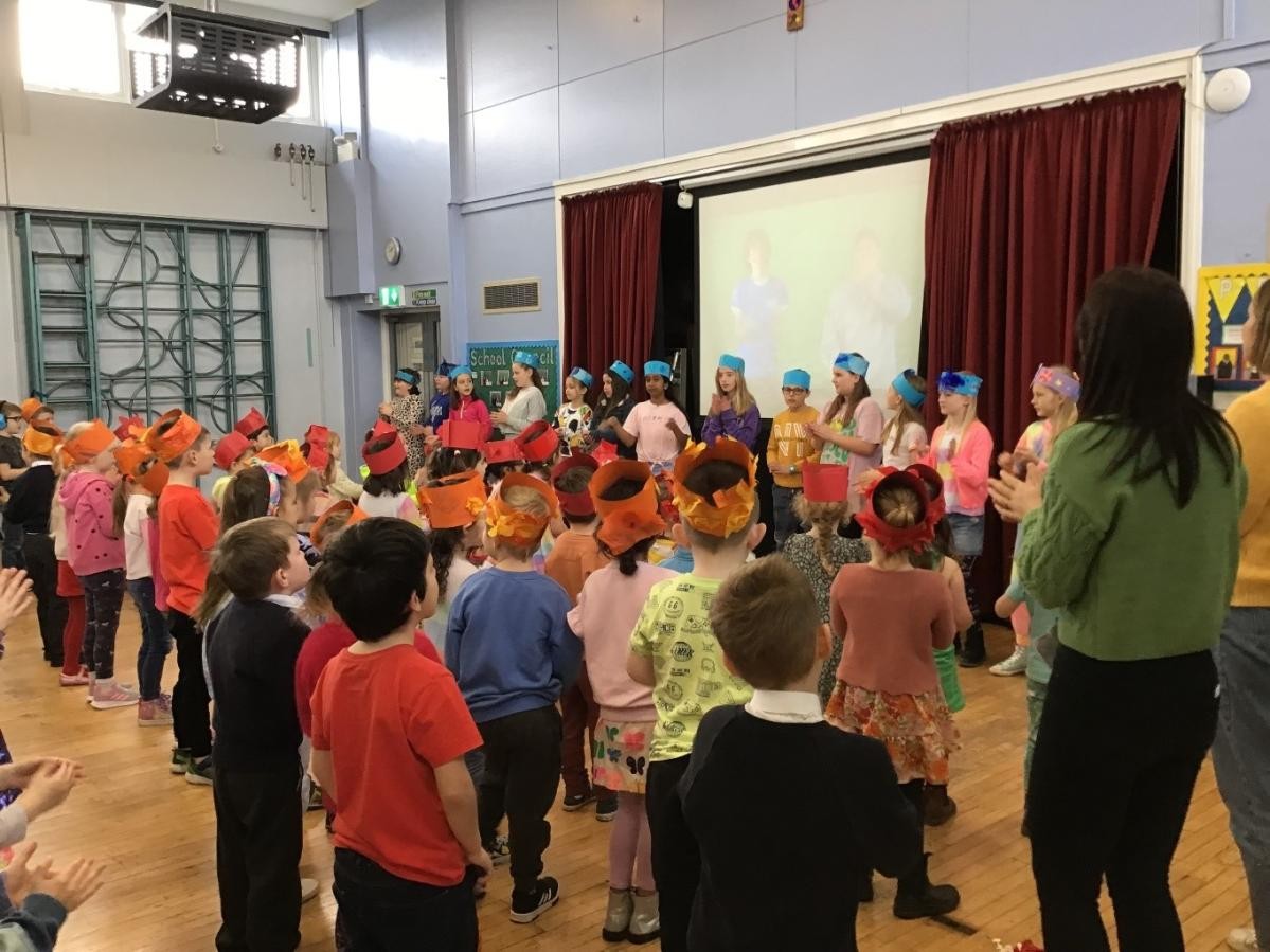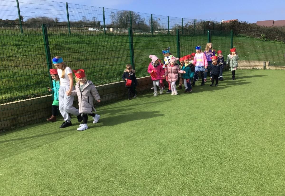 Each class came to school dressed in brightly coloured clothes and wore hats they had made in school in the colours of the rainbow. Each class walked around the school grounds to help raise awareness of global poverty.