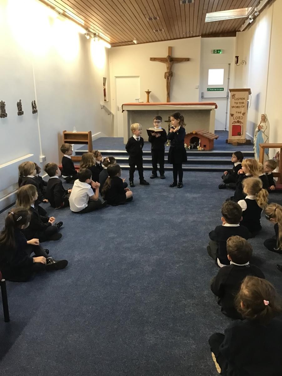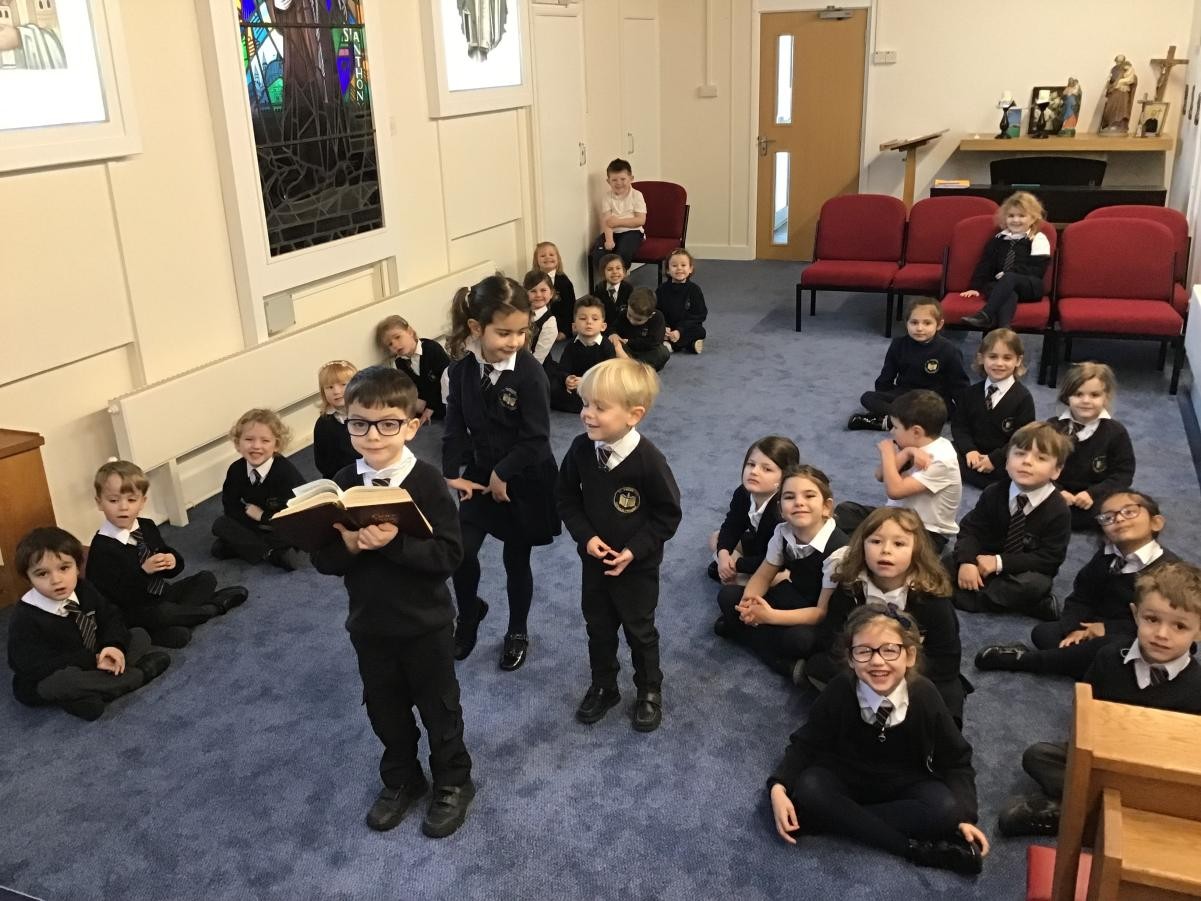 The children in reception listened to the events of Palm Sunday after Jesus had been in the wilderness with His Father for 40 days and 40 nights. The Reception children role played the story and thought in particular about the joy of the people in the city. The Reception Class planned and led a liturgy for the whole school to enjoy about this very special day.