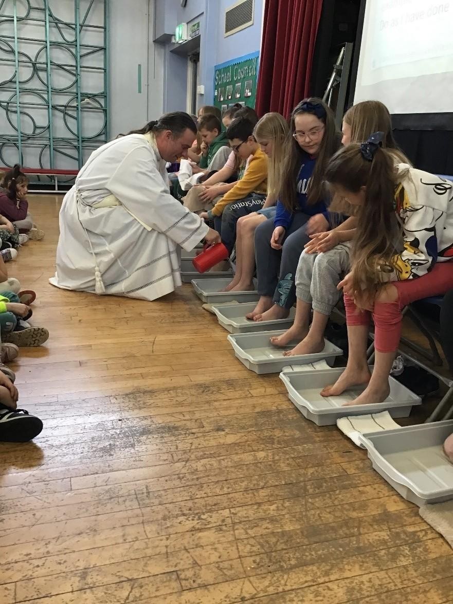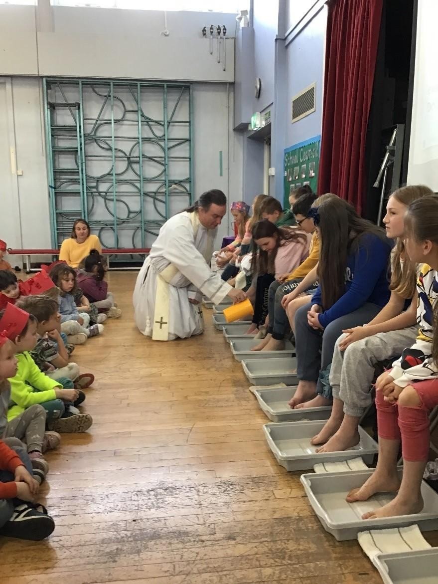 During Holy Thursday Service the children learned about Jesus’ love and service. This really helped us see first-hand how compassion and care are the cornerstones of our faith. As the gospel reading was enacted, Father Anthony showed the love of Jesus as he bent down and washed the feet. The parts of the disciples were played by our Mini Vinnies who also helped Father lead the service and read beautifully.